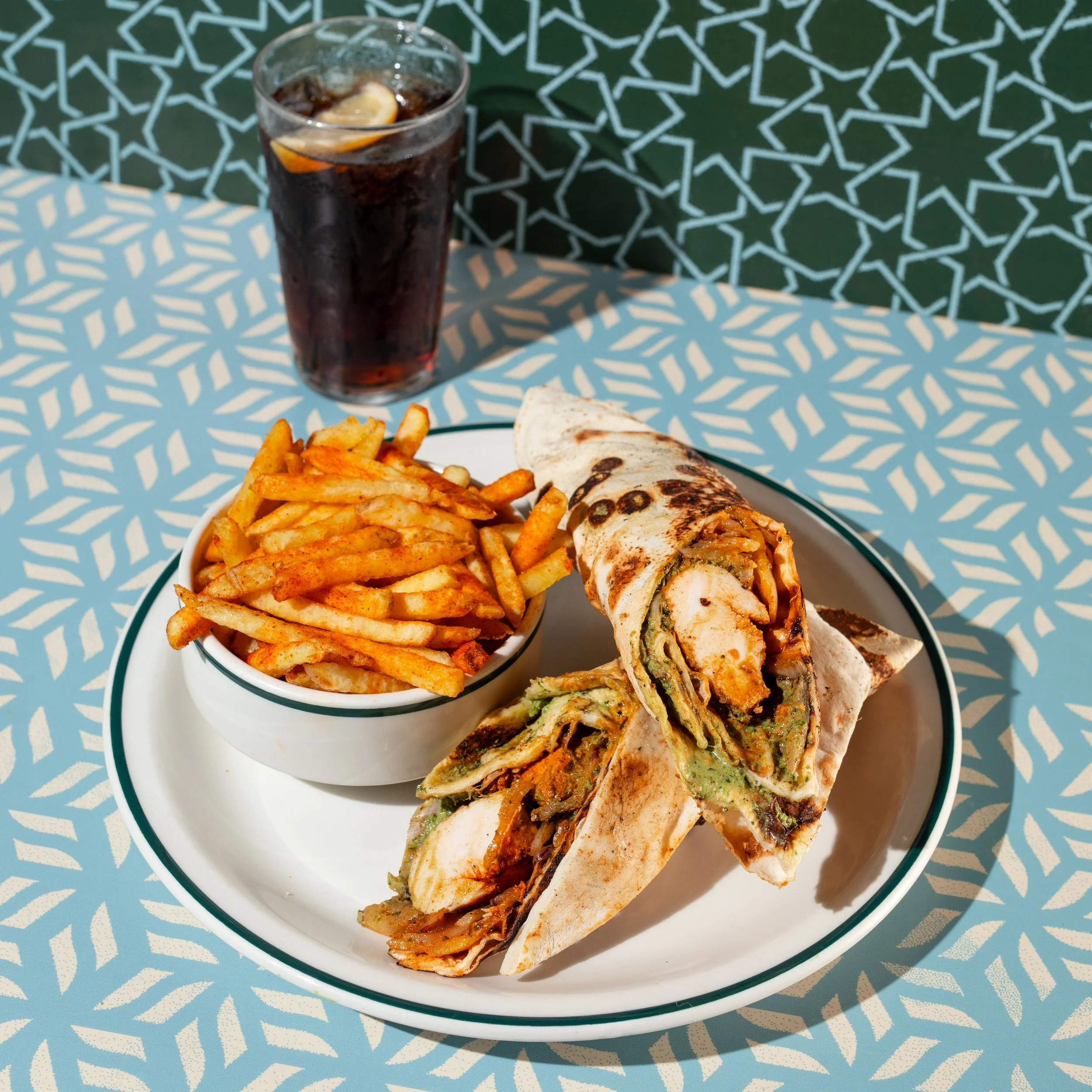 A naan bread… turned sandwich.Soft, warm naan wrapped around bold, home-cooked fillings, served with poppadom, spiced onions and your choice of fries or rice.