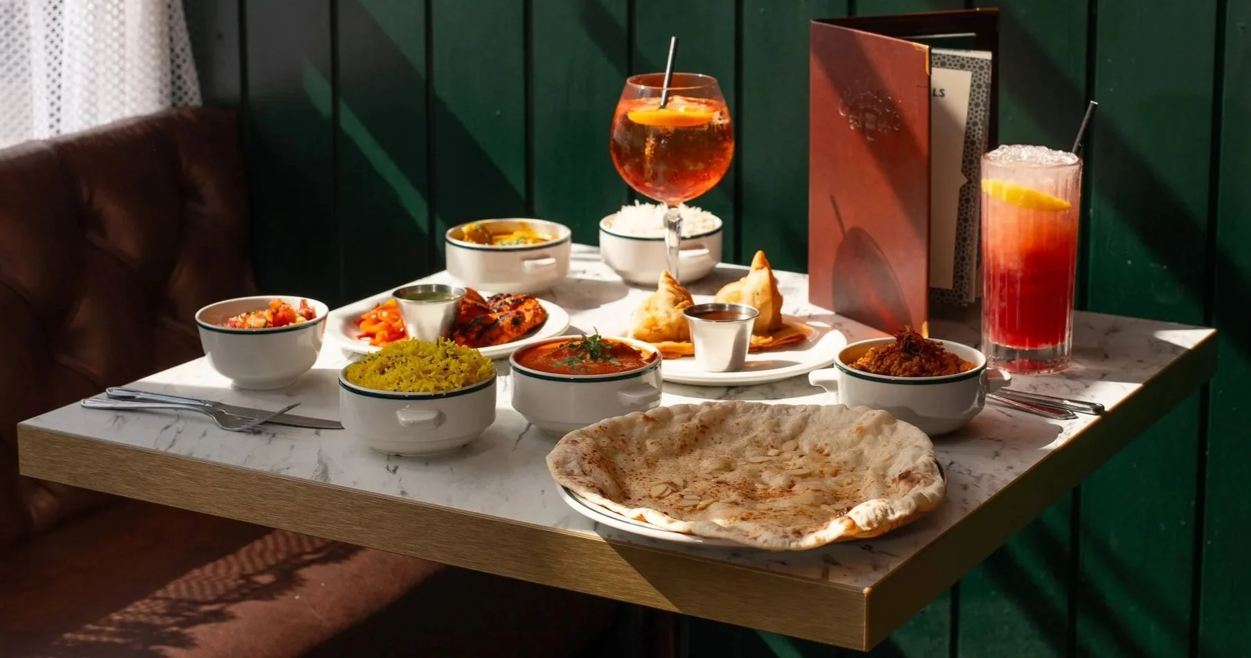Pick one traditional Indian starter, then two curries and a side. Finish off with two scoops of ice-cream.