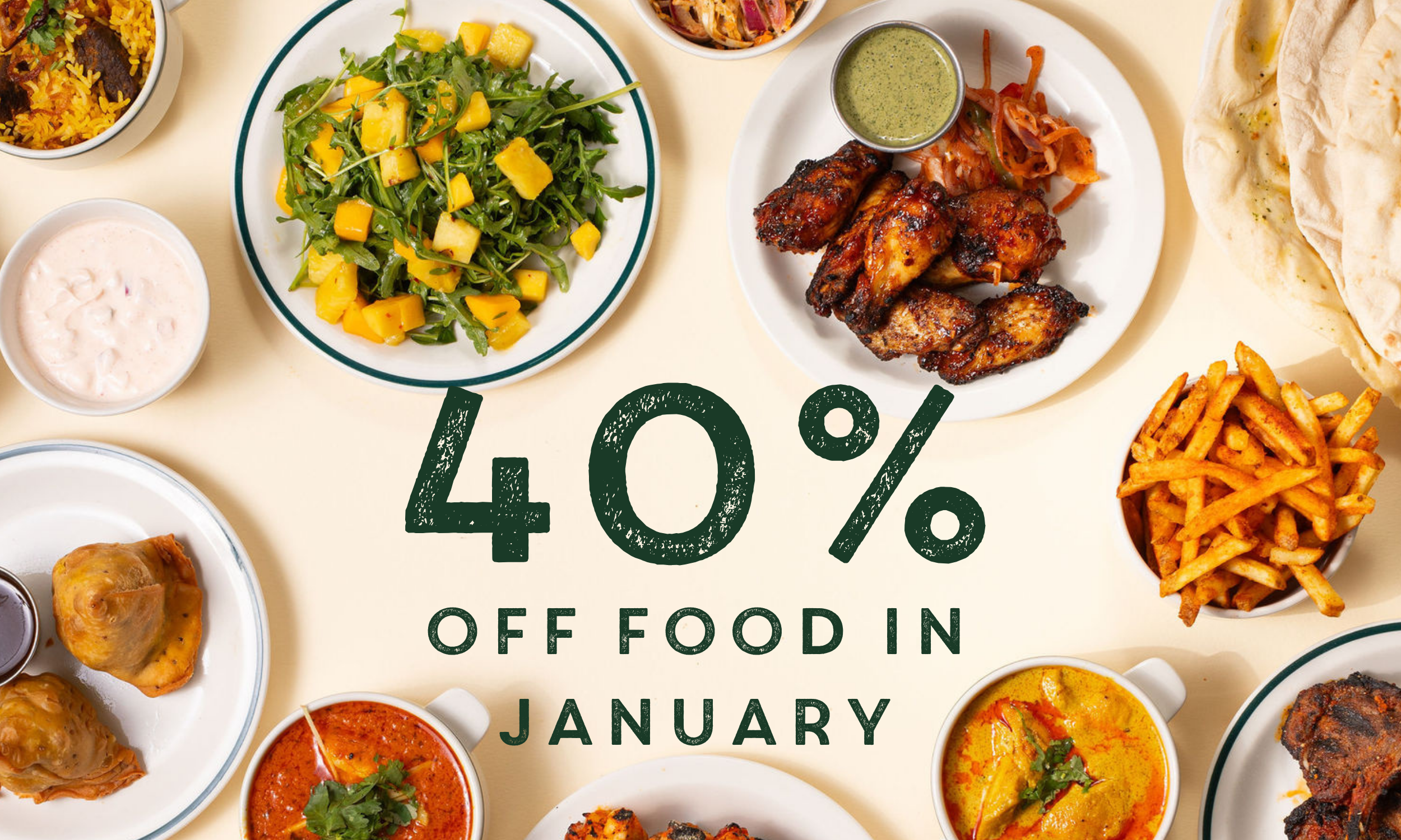 Join us for some January joyfulness and save 40% off your food bill (Up to £10 per person).